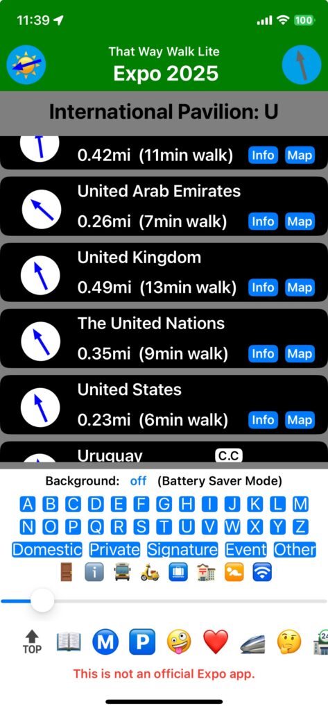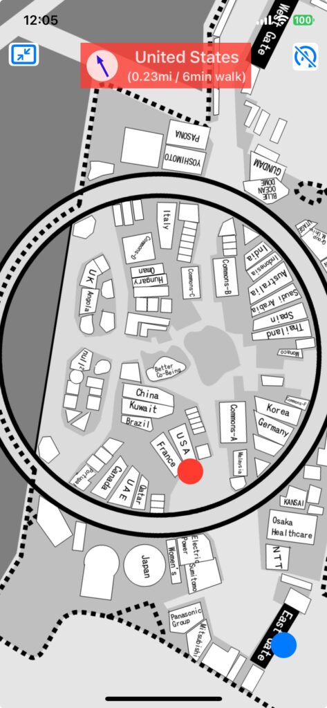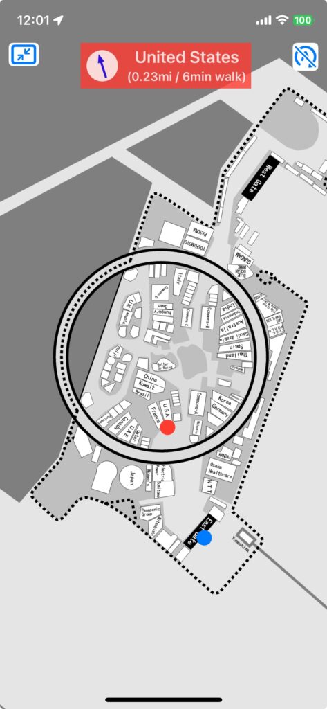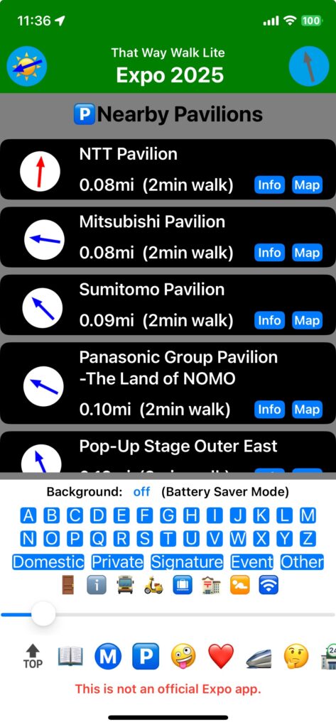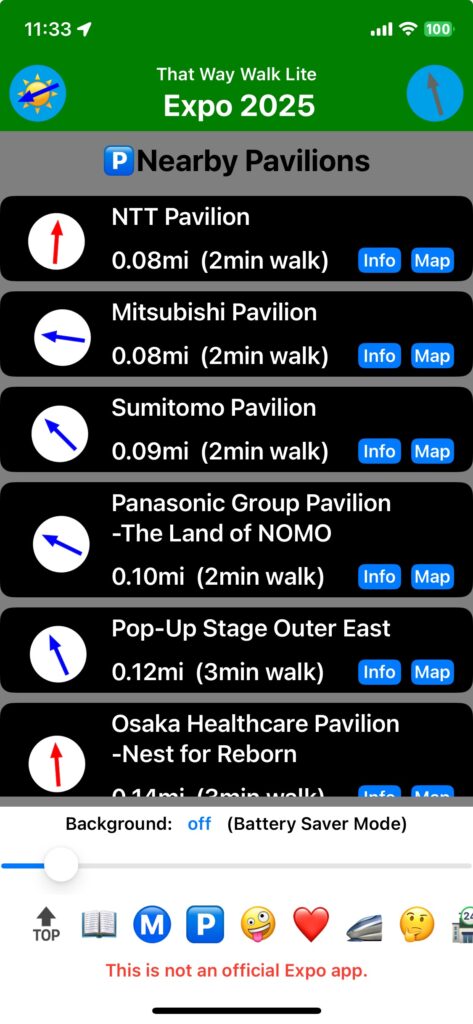 For example, if you are at the East Gate and tap the 🅿️ button, all pavilions will be listed in order of proximity, along with directional and distance information. Just like a compass, the direction indicator rotates with your iPhone’s orientation, always pointing toward each pavilion.